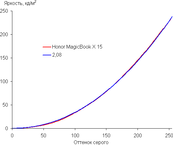 Аппроксимация полученной гамма-кривой дала показатель 2,08, что немного ниже стандартного значения 2,2. При этом реальная гамма-кривая мало отклоняется от аппроксимирующей степенной функции:
