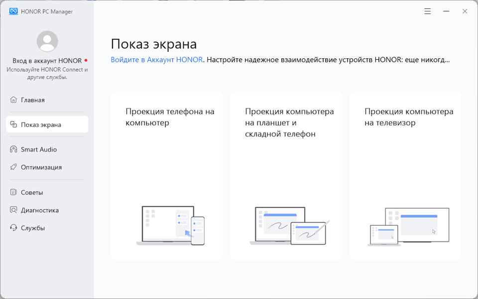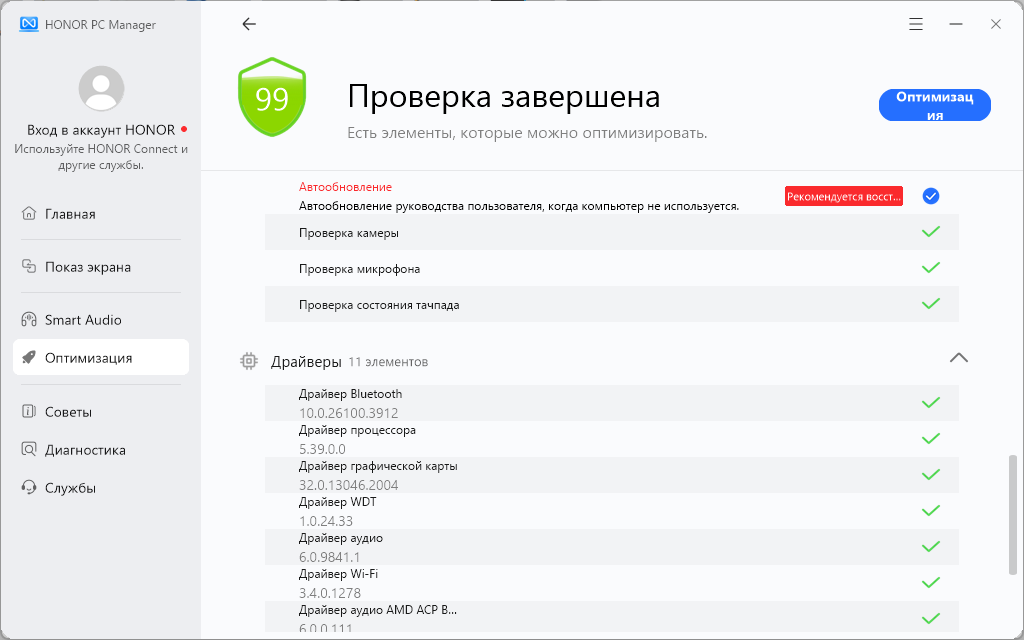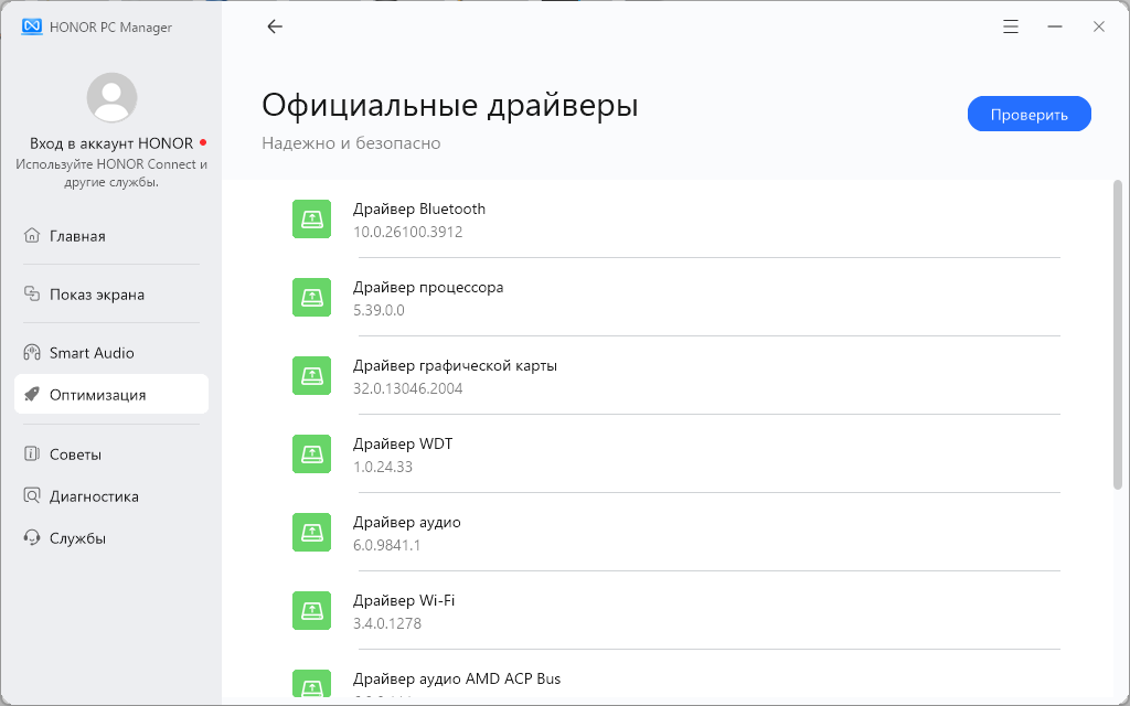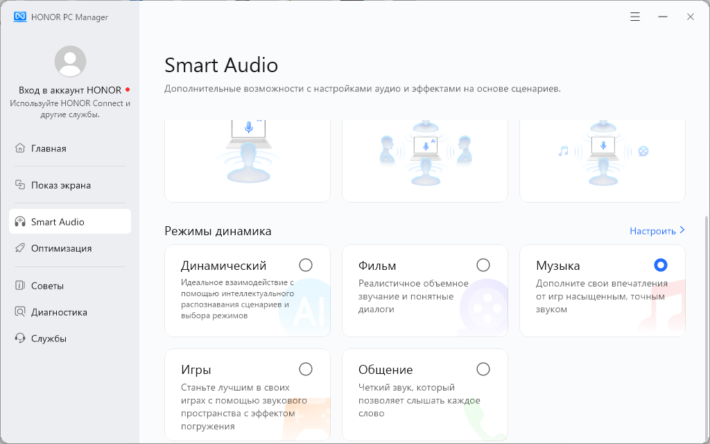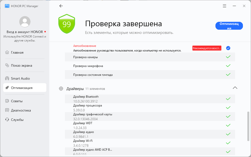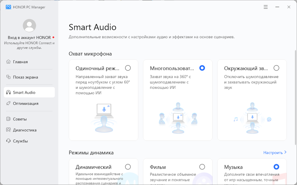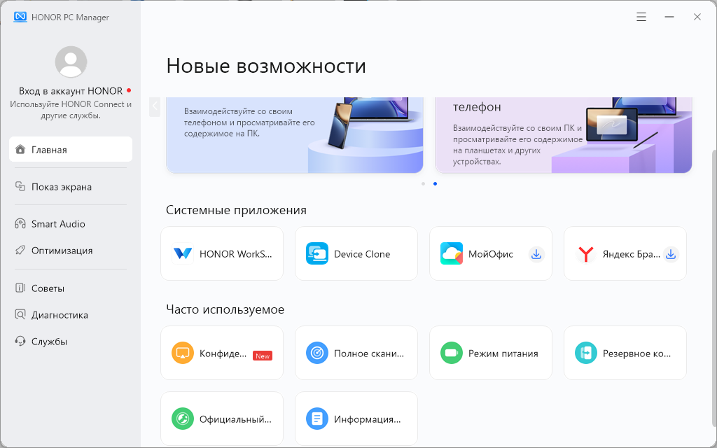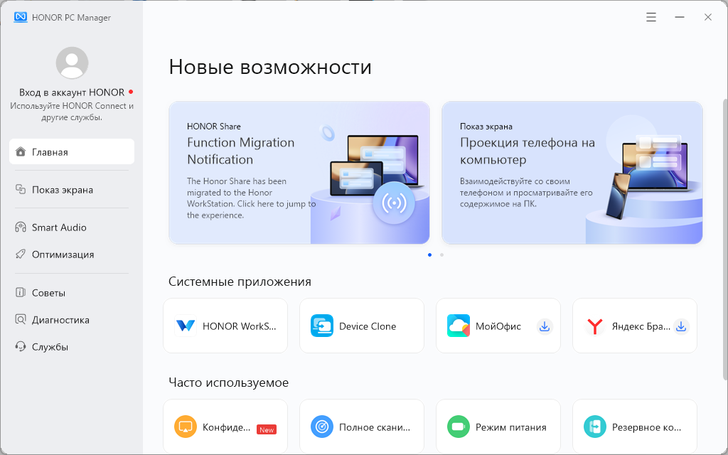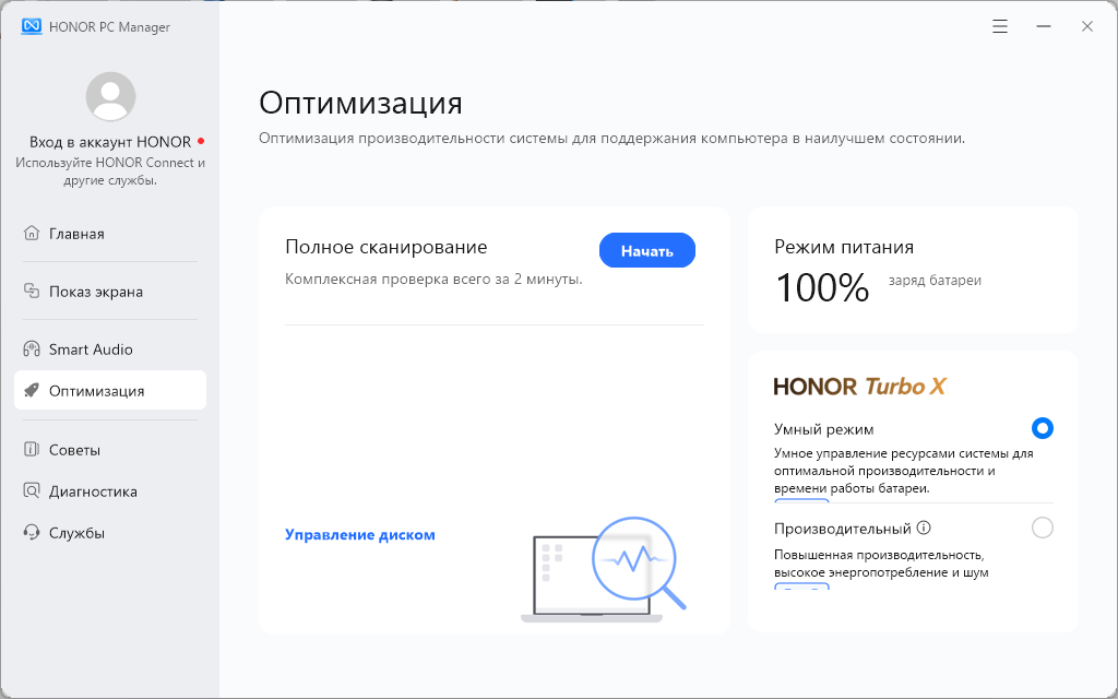 | Приложение | «Умный» режим | Honor PC Manager не загружен |