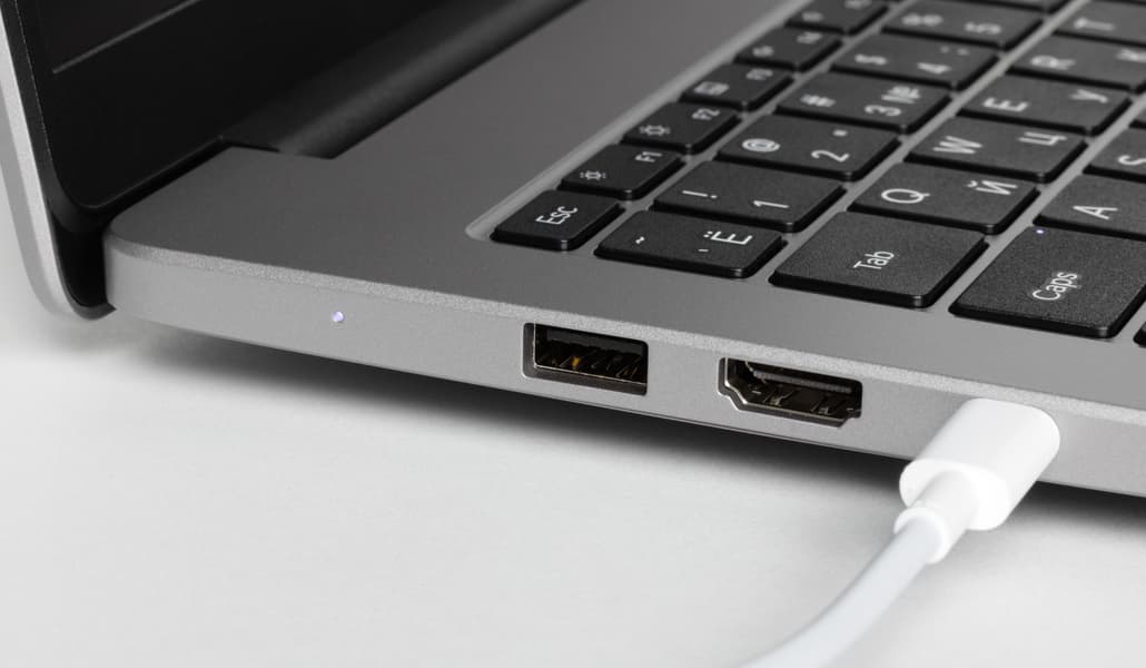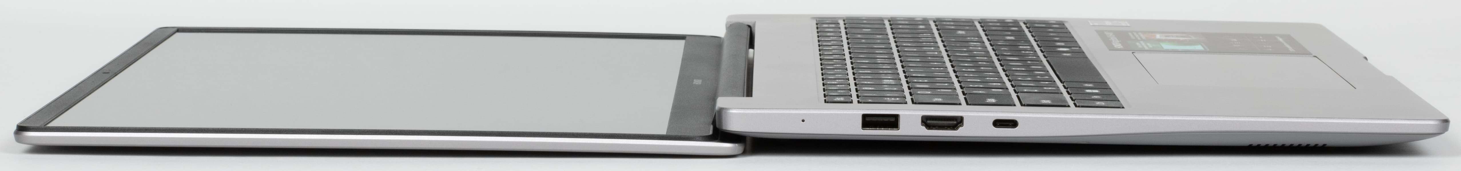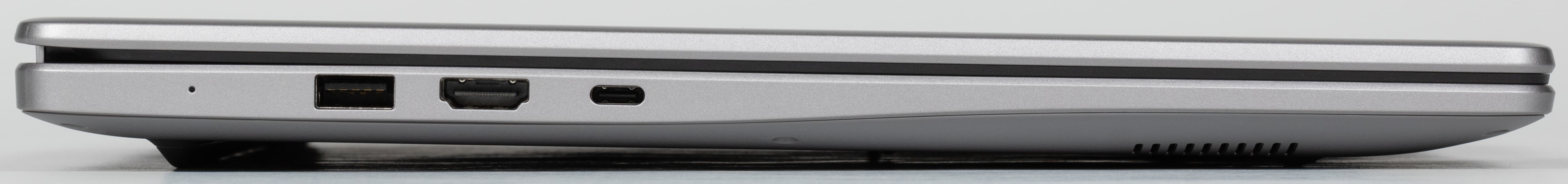 Слева находятся разъем USB Type-C с поддержкой передачи данных, питания Power Delivery и вывода видеосигнала, USB 3.2 Gen1 Type-A и полноразмерный порт HDMI, а также крошечный индикатор питания, который нельзя увидеть при нормальном расположении оператора. Картовода нет.