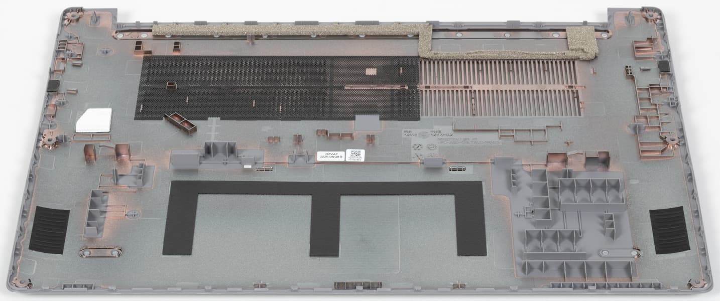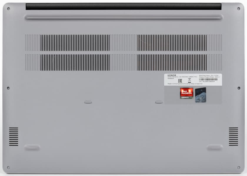 На днище, кроме ножек (спереди две небольшие, сзади одна почти по всей ширине), ближе к задней кромке имеется вентиляционная решетка, через которую происходит забор воздуха для охлаждения компонентов, поэтому ставить ноутбук на мягкую поверхность не следует.