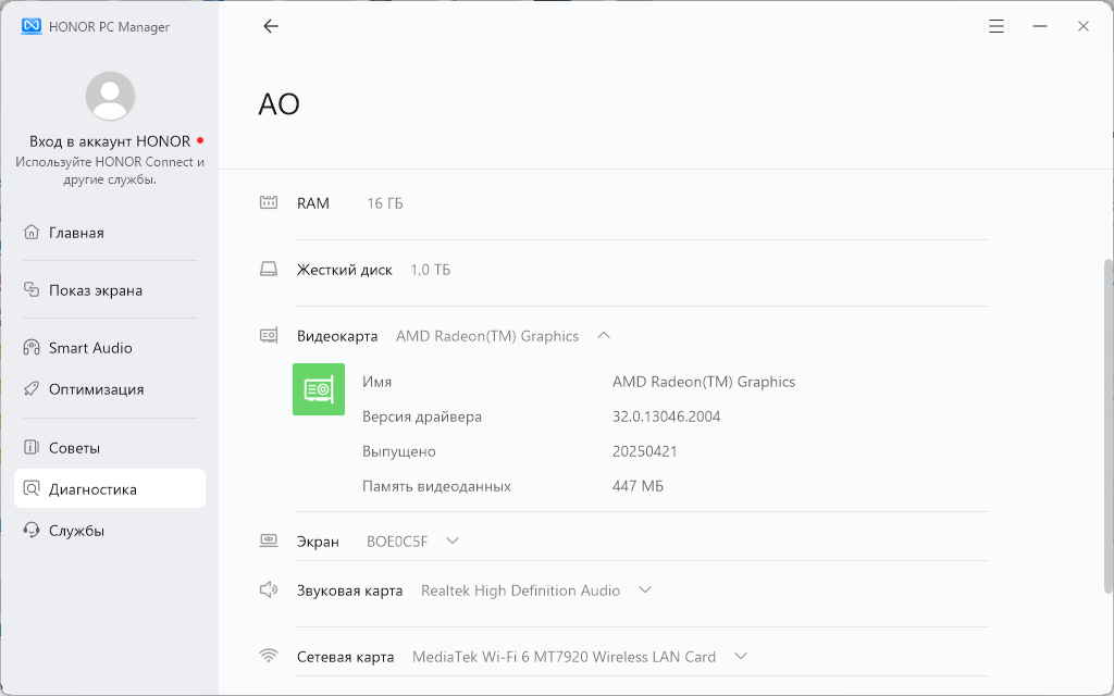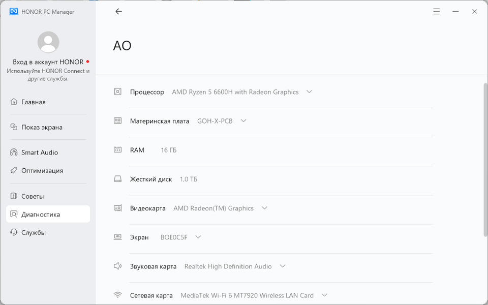 Аппарат поставляется с операционной системой Windows 11 Home и фирменной утилитой Honor PC Manager (мы опробовали версию 19.0.0.75).