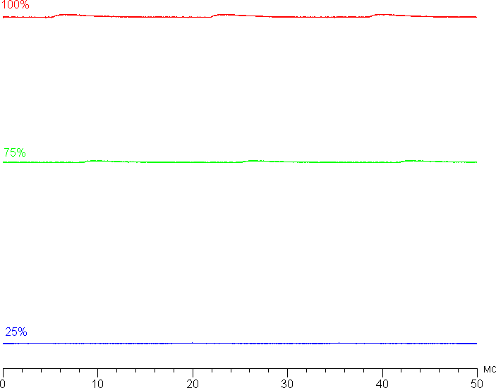 На любом уровне яркости значимая модуляция подсветки отсутствует, поэтому нет и никакого мерцания экрана. В доказательство приведем графики зависимости яркости (вертикальная ось) от времени (горизонтальная ось) при различных значениях настройки яркости: