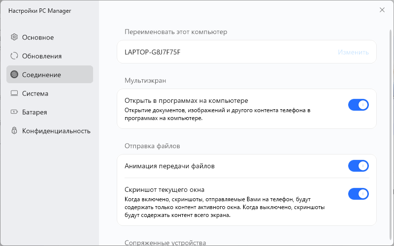 Утилита отображает информацию об устройстве, позволяет проводить некоторые операции обслуживания, обновлять ПО, передавать файлы на находящиеся поблизости устройства без подключения к интернету, выводить на телевизор содержимое экрана ноутбука, а также обеспечивает взаимодействие со смартфоном или планшетом.