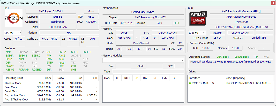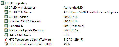 В ноутбуке установлен процессор AMD Ryzen 5 6600H с кодовым наименованием Zen 3+ (Rembrandt-H), он выпускается с начала 2022 года. У него 6 ядер, которые могут работать в два потока на частотах до 3,3 ГГц, а в режиме Boost до 4,5 ГГц, то есть максимальное количество потоков будет двенадцать.