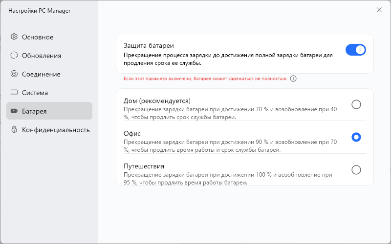 Здесь же есть управление производительностью путем выбора «умного» или «производительного» режима (возможно и быстрое переключение сочетанием Fn+P). Второй можно включить только при питании от внешнего источника и при уровне заряда батареи не менее 20%, причем задействуется он лишь до очередной перезагрузки. Влияние «умности» попытаемся проверить при тестировании.