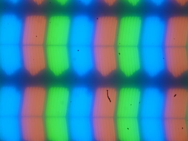В этом ноутбуке используется матрица типа IPS. Микрофотографии демонстрируют типичную для IPS структуру субпикселей (черные точки — это пыль на матрице фотоаппарата):