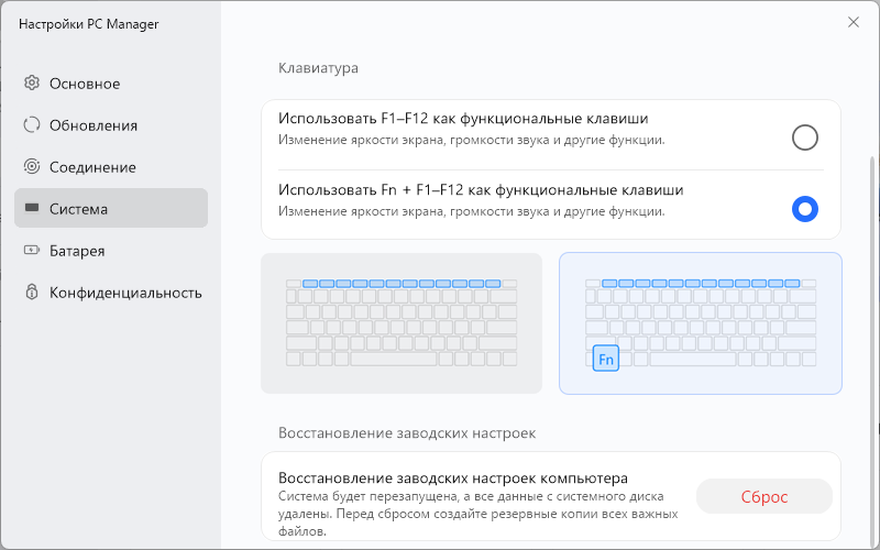 В частности, здесь можно определить поведение кнопок верхнего ряда клавиатуры, чтобы они работали как «горячие клавиши» без нажатия Fn. Есть и управление зарядом батареи (по умолчанию оно отключено, заряд контролируется встроенной BMS ноутбука).