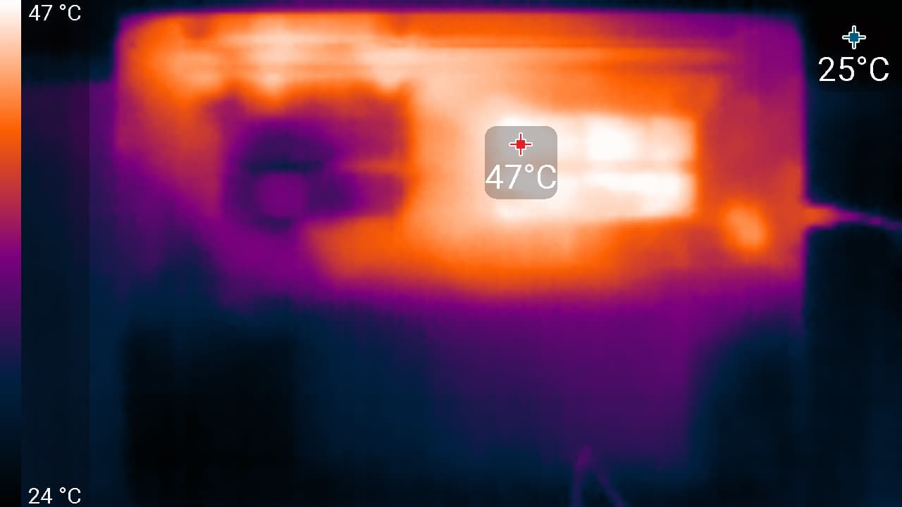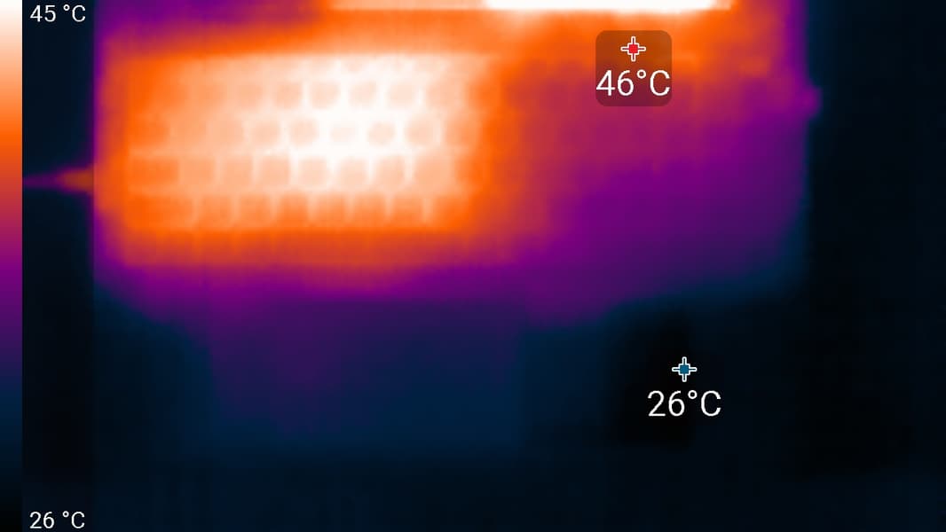 На заднем торце корпуса есть более крупные прорези, через которые система вентиляции выбрасывает нагретый воздух (на фото их не видно: они закрыты изгибом крышки). Получается подогрев правой нижней части экрана, во время запуска «тяжелых» тестов выяснилось: весьма ощутимый, и лишь длительная эксплуатация покажет, насколько это критичный недостаток.