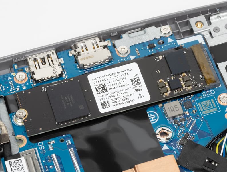 Установлен накопитель SanDisk PC SN5000S (SDEPNSJ-1T00-1036, 1 ТБ, M.2 2280, NVMe, PCIe 4.0 ×4). Как уже говорилось, рядом с ним на плате можно заметить место под еще один SSD М.2 2242, но разъем для него не распаян.
