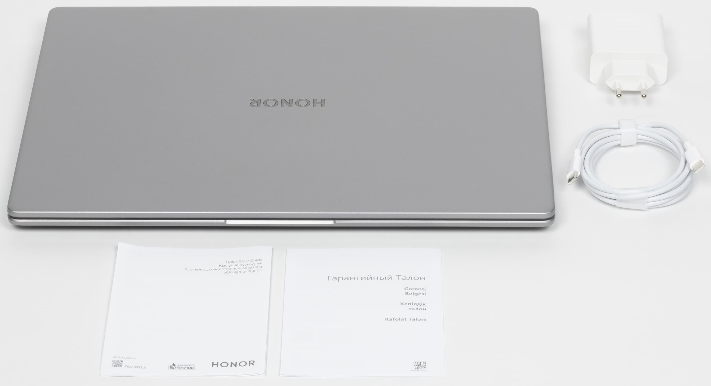 В комплекте, кроме самого ноутбука, идет адаптер питания со сменным выходным кабелем длиной 1,7 м, оснащенным фиксатором-«липучкой», а также набор документации.