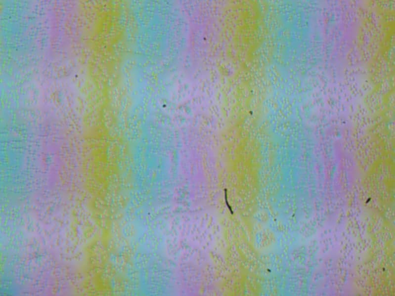Зерно этих дефектов в несколько раз меньше размеров субпикселей (масштаб этих двух фотографий примерно одинаковый), поэтому фокусировка на микродефектах и «перескок» фокуса по субпикселям при изменении угла зрения выражены слабо, из-за этого нет и «кристаллического» эффекта.