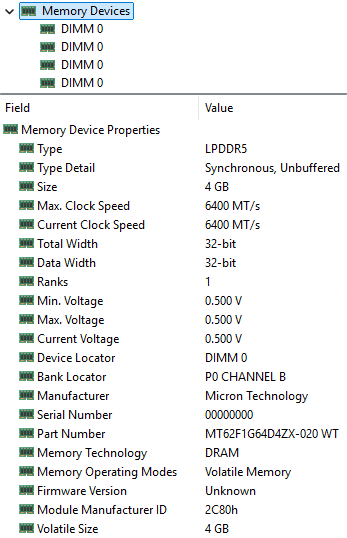 На системной плате распаяны чипы памяти LPDDR5-6400 производства Micron Technology Inc. Утилиты могут рапортовать о четырехканальном режиме, но он соответствует двухканальному режиму DDR4.