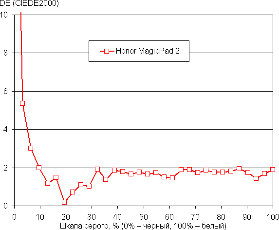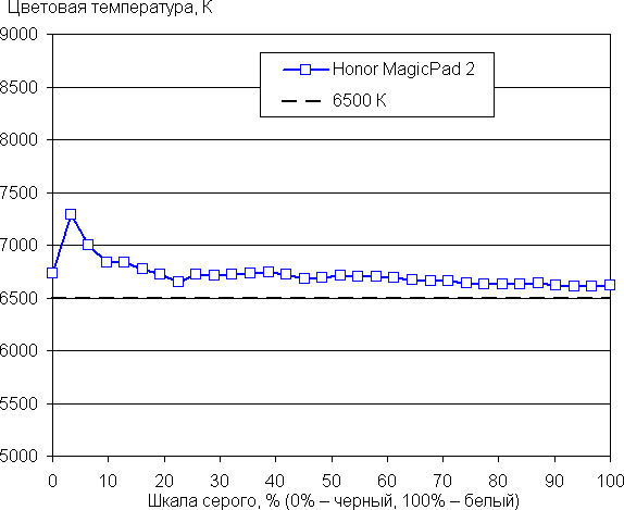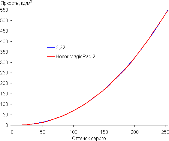 Напомним, что в случае OLED-экранов яркость фрагментов изображения динамично меняется в соответствии с характером выводимого изображения — чуть уменьшается для светлых в целом изображений. В итоге полученная зависимость яркости от оттенка (гамма-кривая), скорее всего, неточно соответствует гамма-кривой статичного изображения, так как измерения проводились при последовательном выводе оттенков серого почти на весь экран.