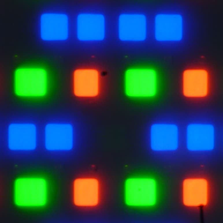 В этом экране используется матрица OLED — активная матрица на органических светодиодах. Полноцветное изображение создается с помощью субпикселей трех цветов — красного (R), зеленого (G) и синего (B) в равном количестве, а синий субпиксель состоит из двух частей. Это подтверждается фрагментом микрофотографии: