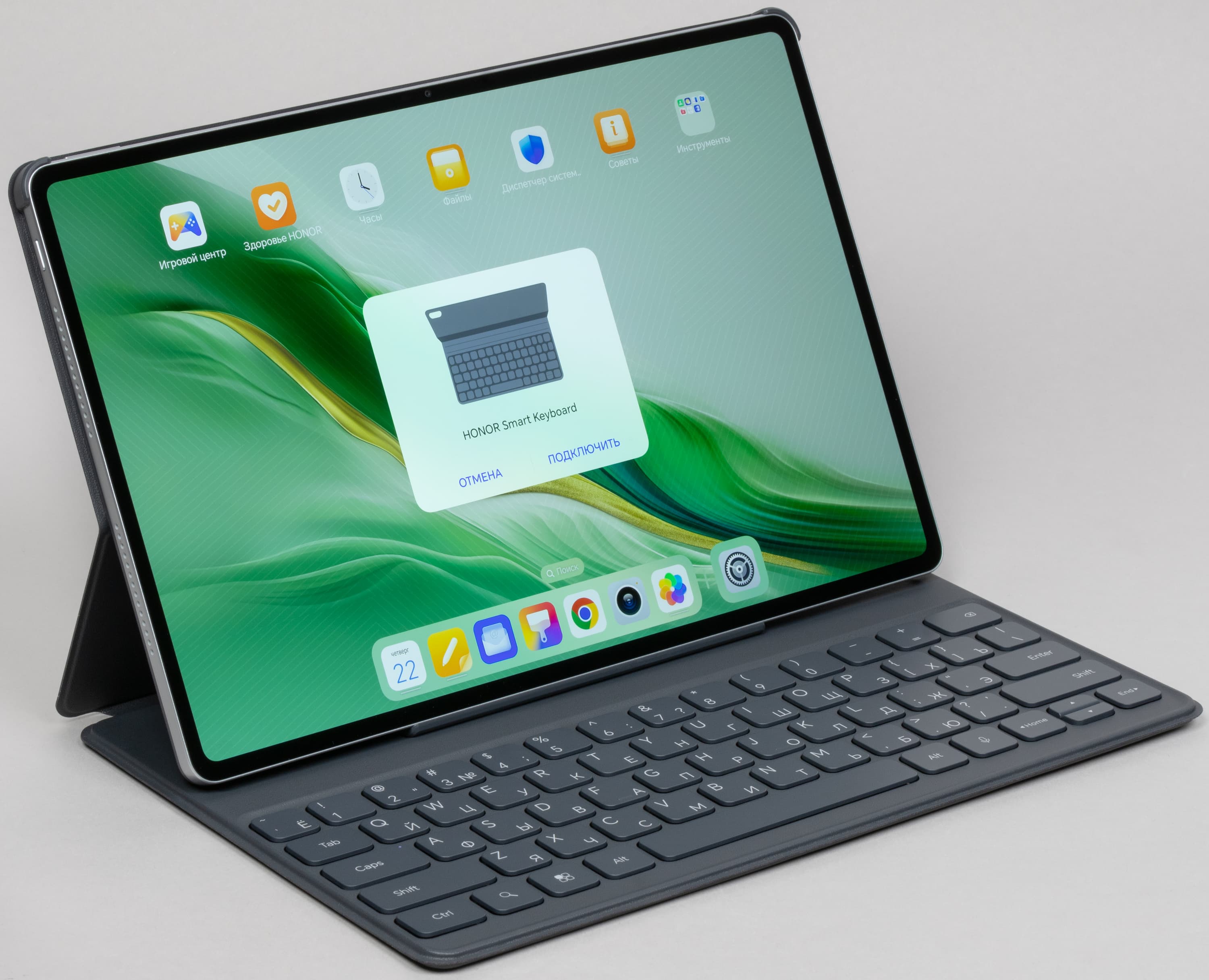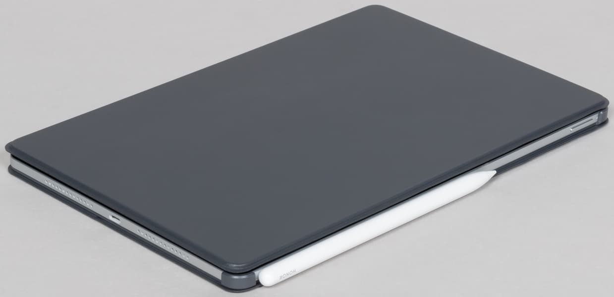 Теперь посмотрим на обложку-клавиатуру. В целом, она очень похожа на аксессуар, который мы тестировали вместе с Honor Pad 9, но здесь нет никаких разъемов