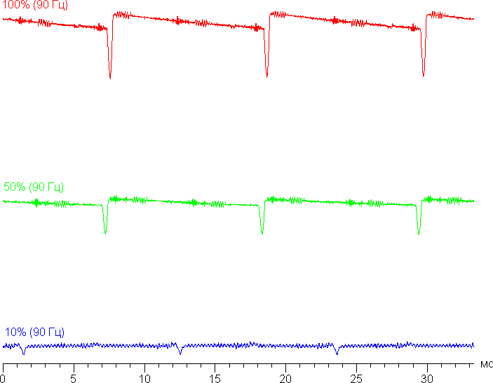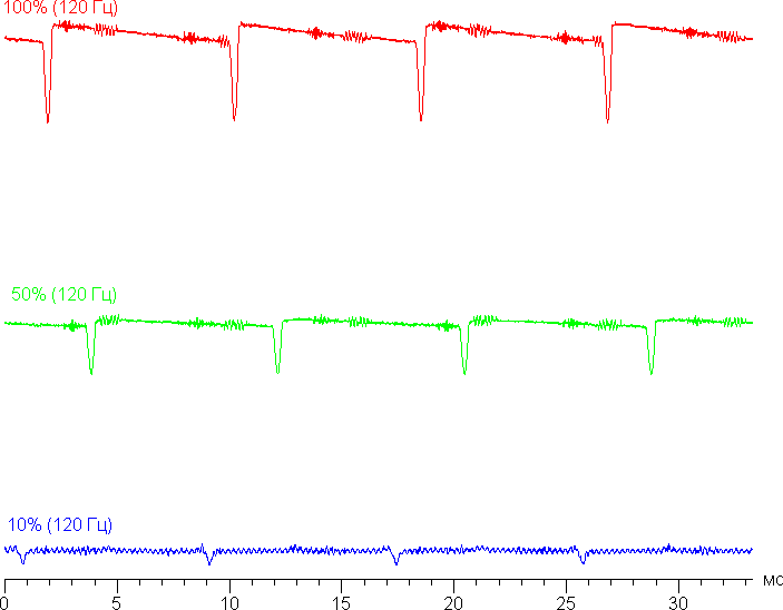 Теперь на высокой и средней яркости частота модуляции увеличилась в 2 раза (относительно режима 60 Гц), а на низкой яркости характер модуляции также принципиально не изменился. Видимого мерцания опять нет.