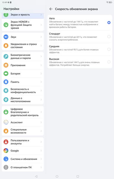 В настройках экрана можно включить режим с повышенной до 90 или до 144 Гц частотой обновления: