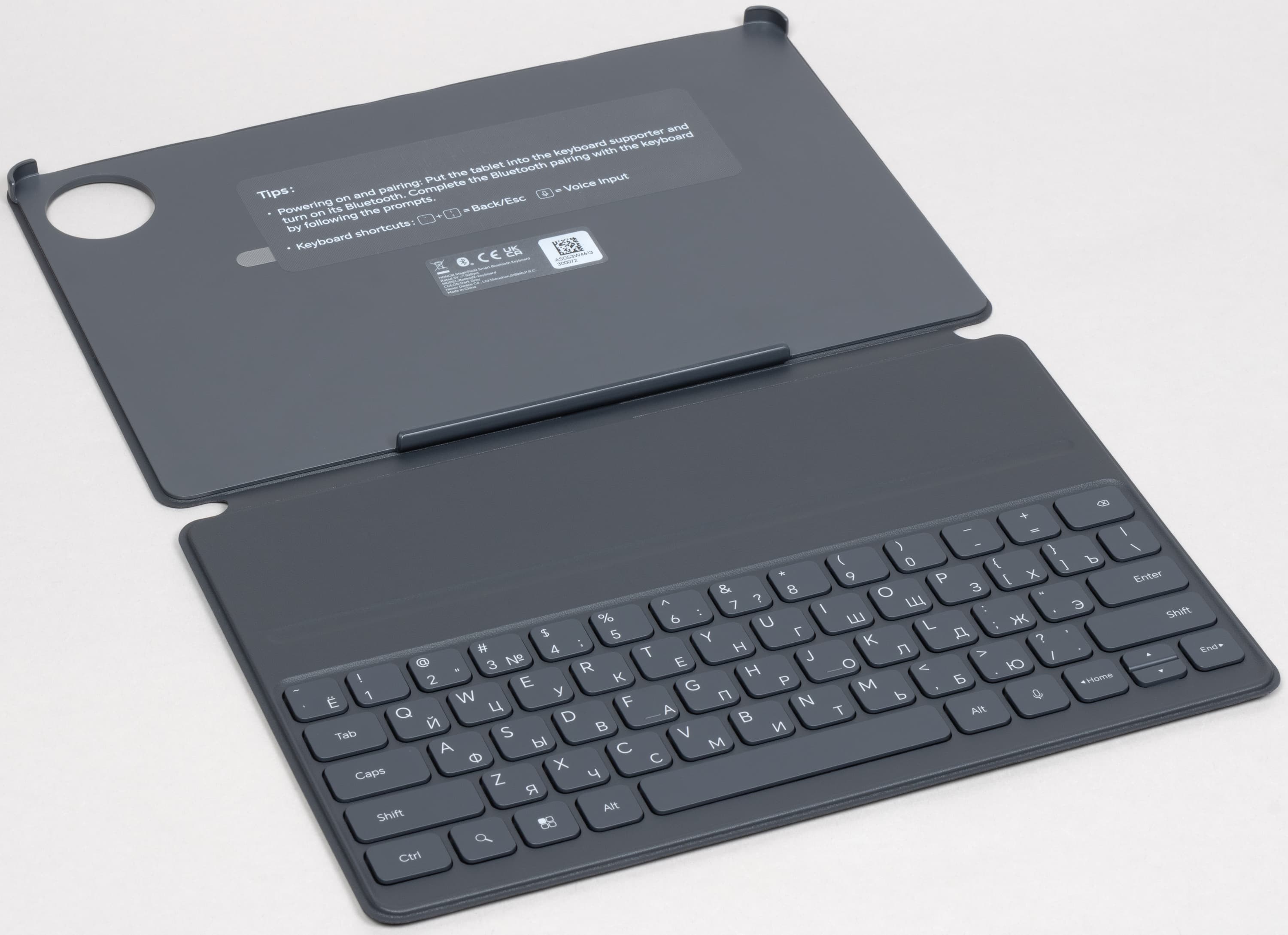 Ход клавиш по меркам подобных аксессуаров довольно высокий и четкий, есть русификация клавиатуры, печать вслепую вполне возможна — размер клавиш и раскладка это позволяют. Однако переключение языков со штатной виртуальной клавиатурой невозможно, эта проблема решается добавлением любой сторонней виртуальной клавиатуры (например, Яндекса). Хочется надеяться, что Honor выпустит апдейт и сделает так, чтобы всё работало «из коробки». И еще одна деталь: при отсоединении Smart Bluetooth Keyboard от планшета на клавиатуре начинает мигать белым индикатором кнопка Caps — и продолжается это до подсоединения планшета, причем мигание продолжится, даже если отменить сопряжение по Bluetooth. Это немного раздражает, когда вы хотите просто на время снять обложку и поработать с планшетом без нее.