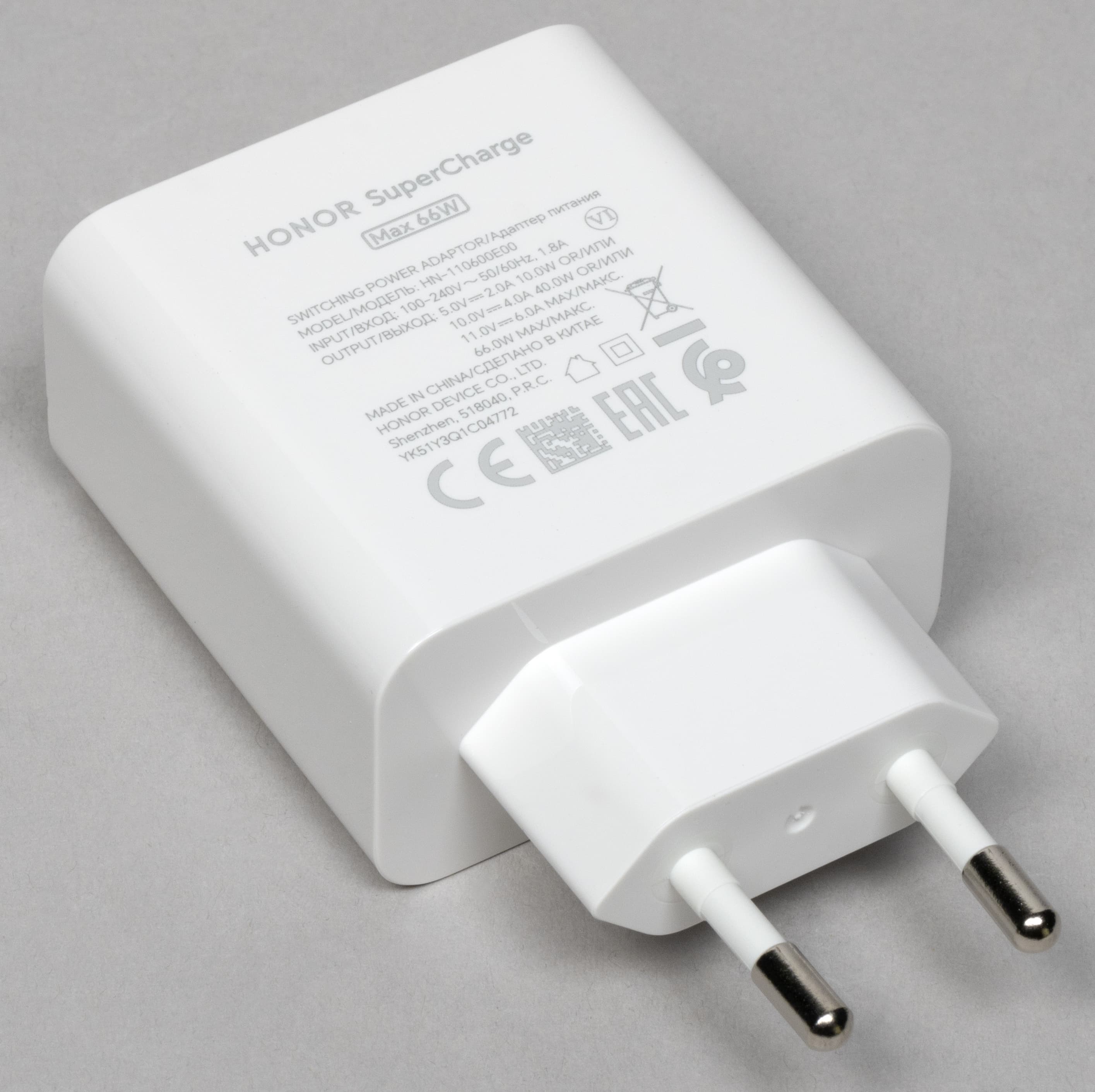 Внутри основного бокса — только зарядное устройство, кабель USB-A—USB-C (для зарядки) и краткое руководство пользователя. Важно обратить внимание, что ЗУ поддерживает технологию Honor SuperCharge, причем мощность его еще выше, чем у Honor Pad 9: до 66 Вт (11 В 6 А).