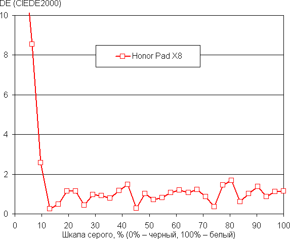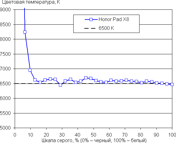После ручной коррекции (положение точки как на снимке выше) удалось приблизить цветовую температуру к стандартным 6500 К, и сохранить отклонение от спектра абсолютно черного тела (ΔE) на низком значении, ниже 2 единиц, что даже для профессионального устройства считается отличным показателем. При этом цветовая температура и ΔE мало изменяются от оттенка к оттенку — это положительно сказывается на визуальной оценке цветового баланса. (Самые темные области шкалы серого можно не учитывать, так как там баланс цветов не имеет большого значения, да и погрешность измерений цветовых характеристик на низкой яркости большая.)