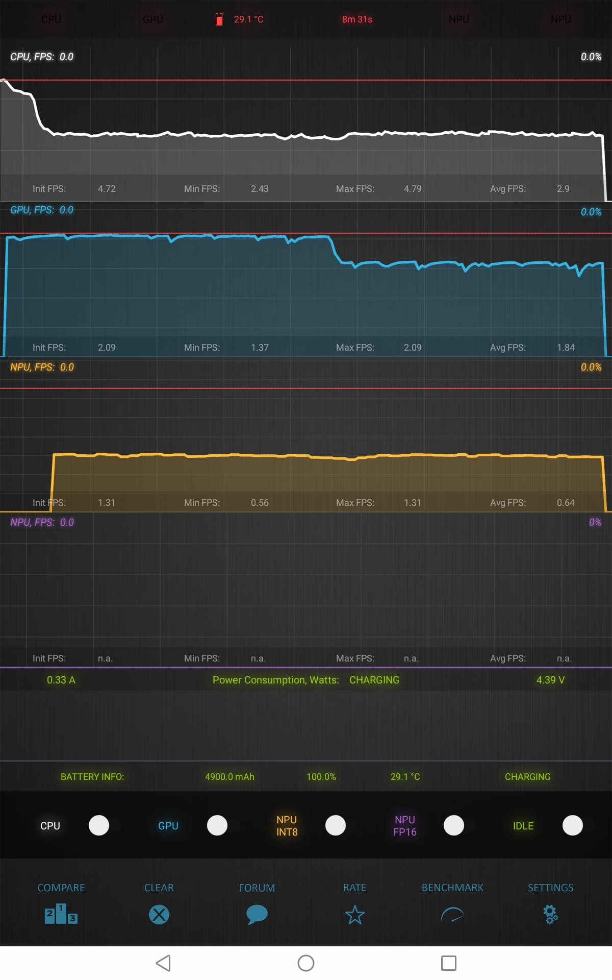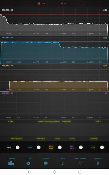 Тест на снижение производительности при нагреве мы проводим с помощью программы Burnout Benchmark, которая позволяет нагружать CPU, GPU и NPU: