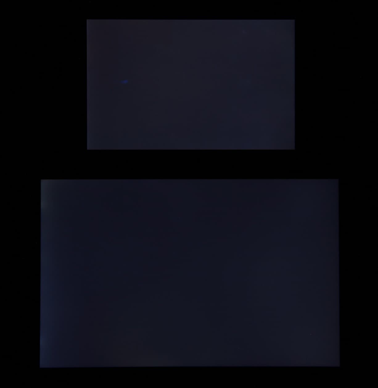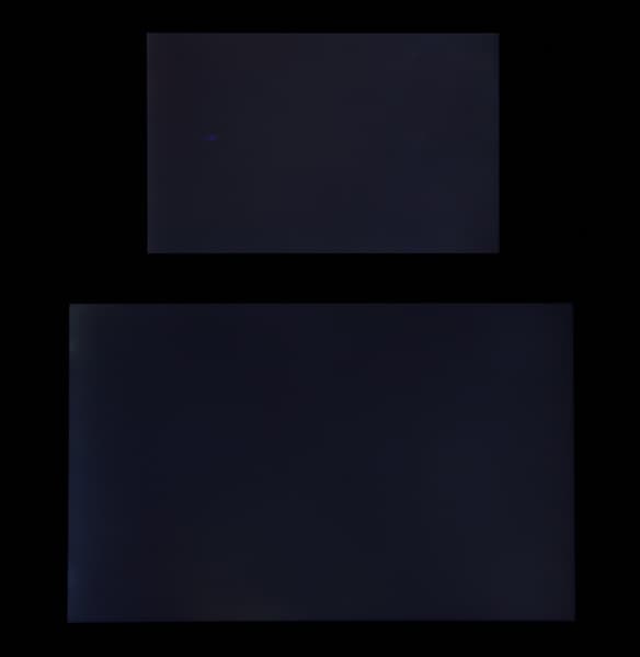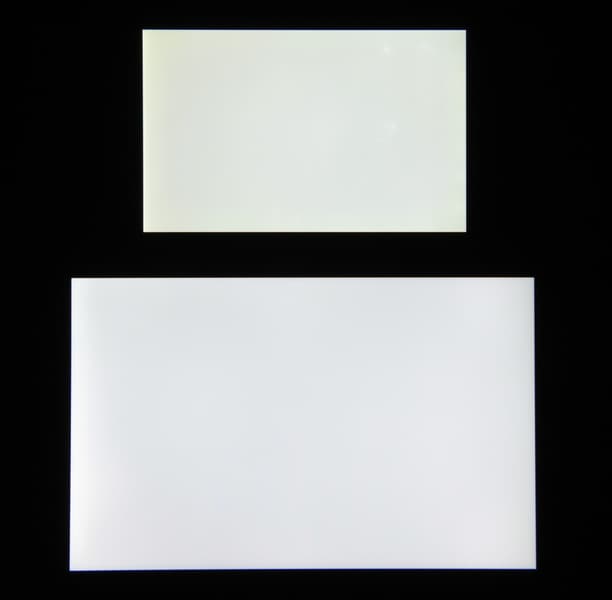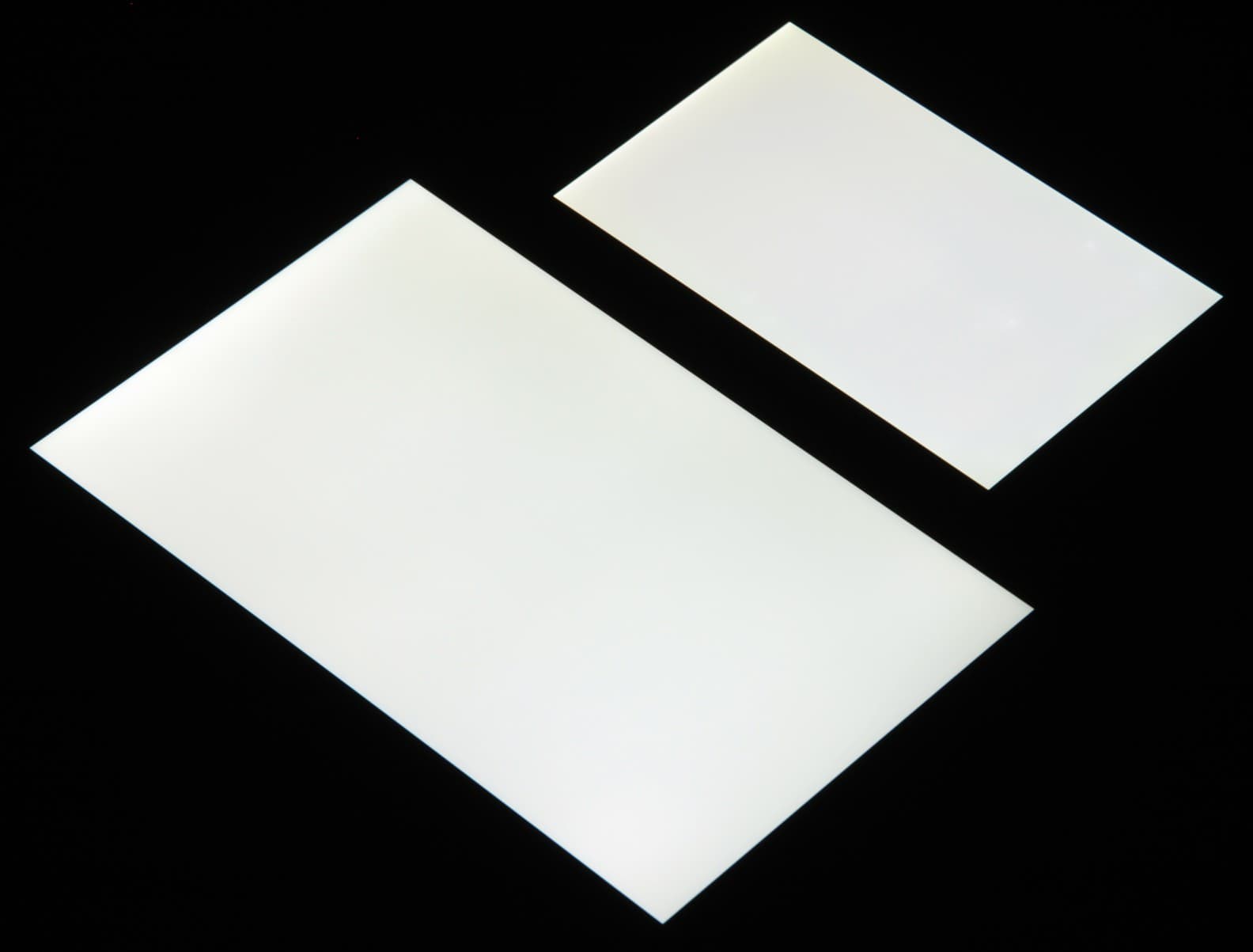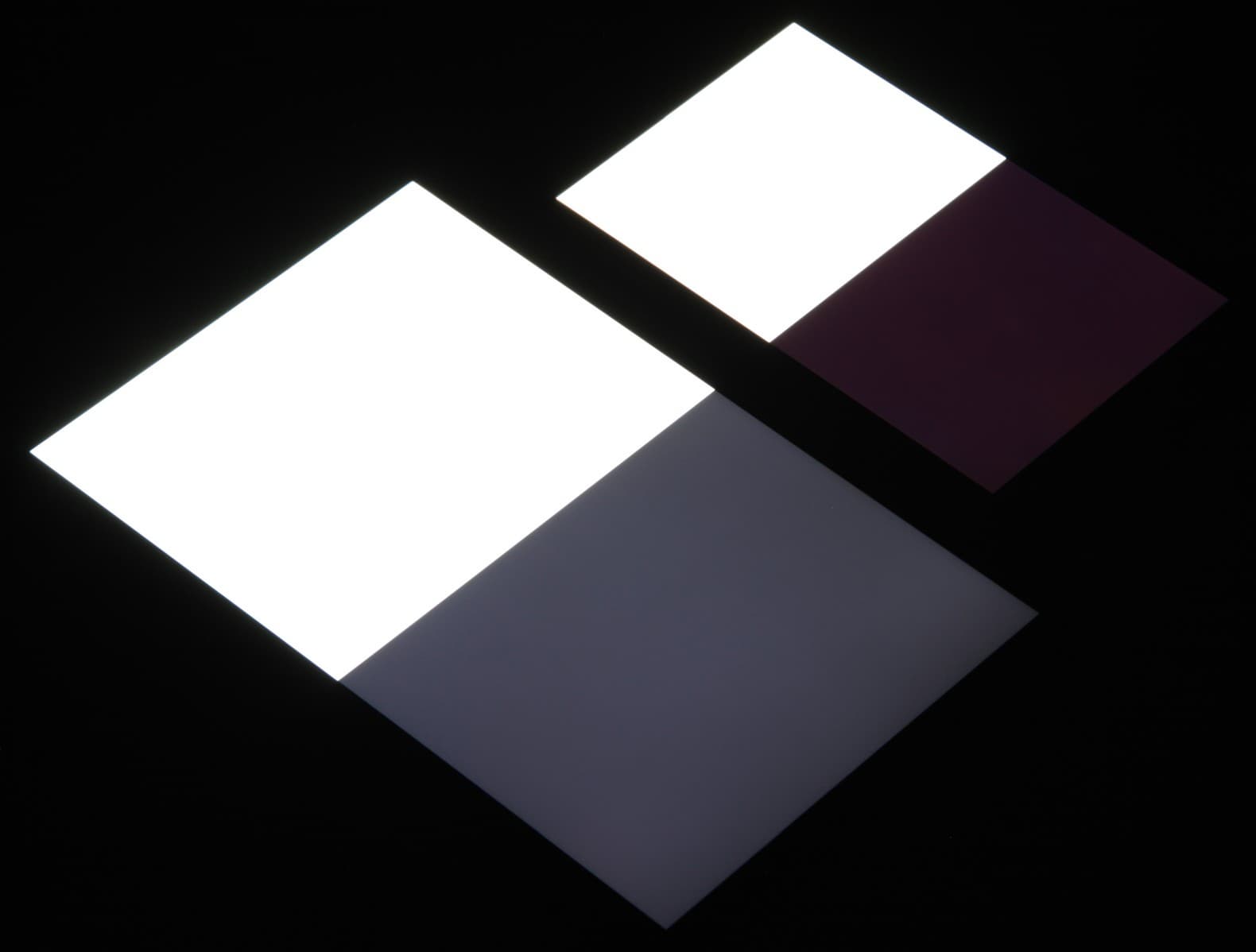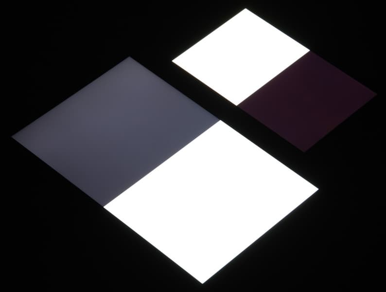 Яркость под углом у экранов уменьшилась (как минимум в 5 раз, исходя из разницы в выдержке), но в случае Honor Pad X8 яркость снизилась чуть меньше. Черное поле при отклонении по диагонали сильно высветляется, но остается условно нейтрально-серым (так это воспринимают глаза). Фотографии ниже это демонстрируют (яркость белых участков в перпендикулярном плоскости экранов направлении одинаковая!):