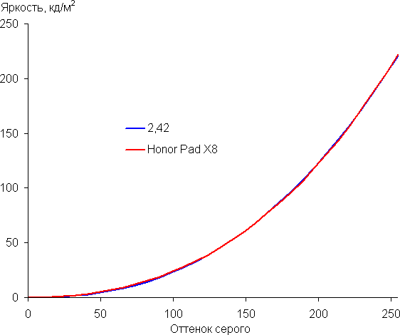 Контрастность (примерно в центре экрана) высокая — порядка 1100:1. Время отклика при переходе черный-белый-черный равно 21 мс (11 мс вкл. + 10 мс выкл.). Переход между полутонами серого 25% и 75% (по численному значению цвета) и обратно в сумме занимает 34 мс. Построенная по 32 точкам с равным интервалом по численному значению оттенка серого гамма-кривая не выявила завала ни в светах, ни в тенях. Показатель аппроксимирующей степенной функции равен 2,42, что выше стандартного значения 2,2, поэтому картинка немного затемнена. При этом реальная гамма-кривая мало отклоняется от степенной зависимости: