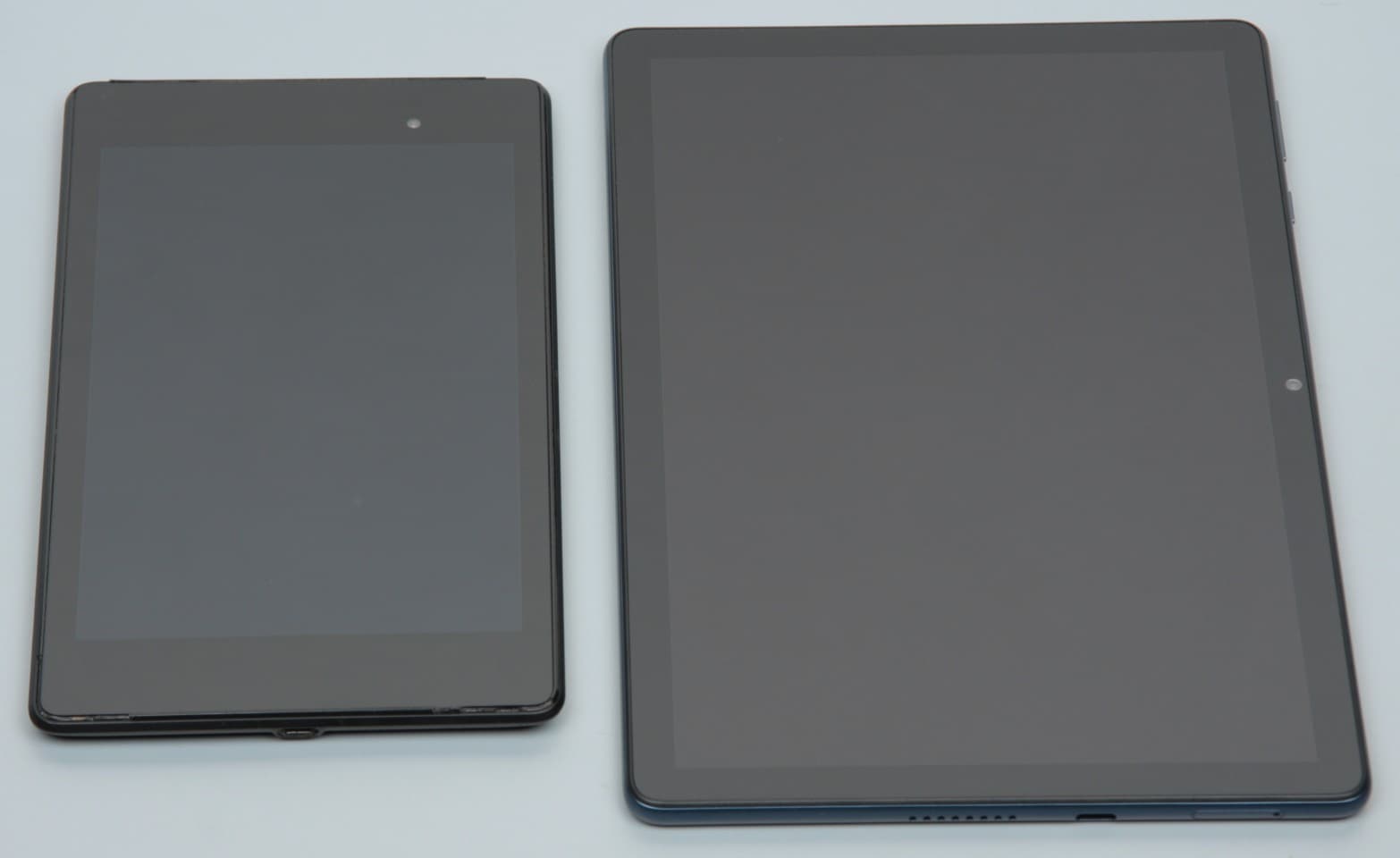 Лицевая поверхность экрана выполнена в виде стеклянной пластины с зеркально-гладкой поверхностью, устойчивой к появлению царапин. Судя по отражению объектов, антибликовые свойства экрана не хуже, чем у экрана Google Nexus 7 (2013) (далее просто Nexus 7). Для наглядности приведем фотографию, на которой в выключенных экранах отражается белая поверхность (справа — Honor Pad X8, слева — Nexus 7, далее их можно различать по размеру):