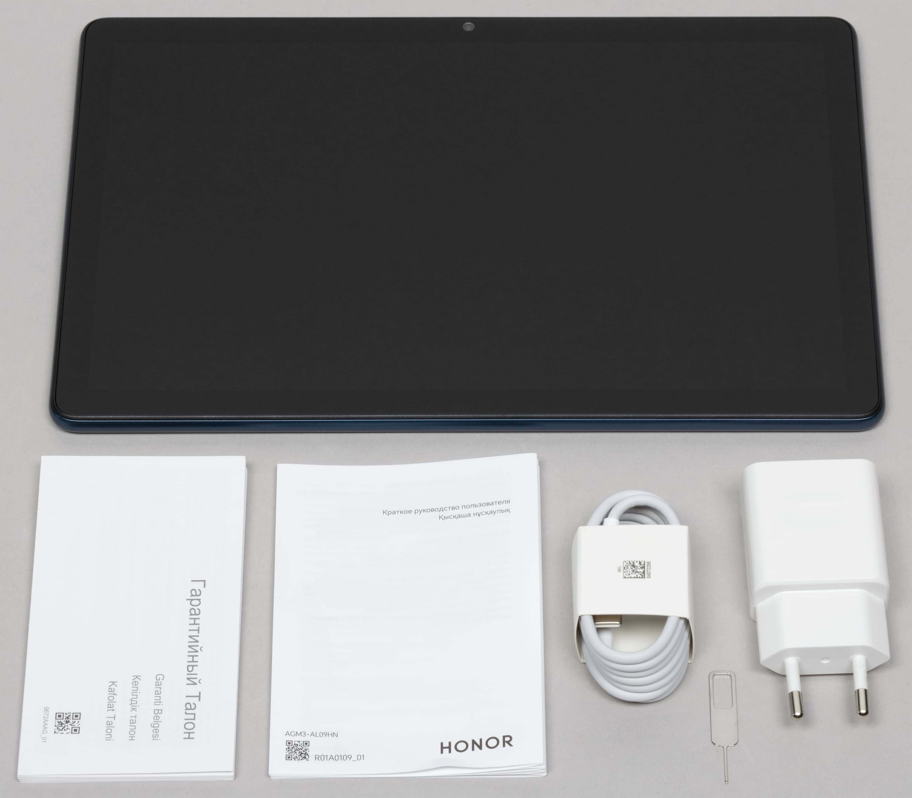 Внутри бокса — тоже никаких сюрпризов: зарядное устройство, кабель USB-A / USB-C, краткое руководство пользователя, ключик для извлечения SIM-карты/microSD и гарантийный талон.