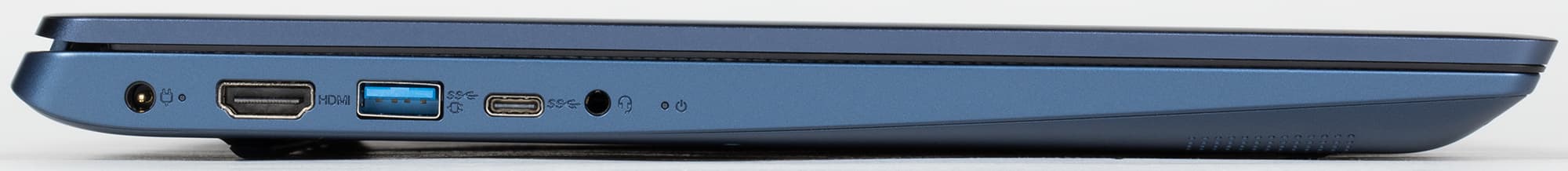 Слева находятся гнездо питания с индикатором заряда, полноразмерный порт HDMI, второй USB3 Gen1 Type-A и единственный USB3 Gen2 Type-C (он поддерживает только передачу данных), комбинированный миниджек для аудиогарнитуры и белый индикатор включения.