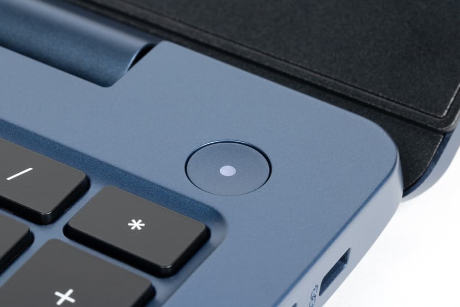 Круглая кнопка Power находится справа вне клавиатуры, причем заподлицо с поверхностью, что исключает ошибочные нажатия. В нее встроен белый индикатор включения, позволяющий легко увидеть эту кнопку в затемненном помещении, но только когда ноутбук работает. Для включения кнопку надо удерживать 2-3 секунды.