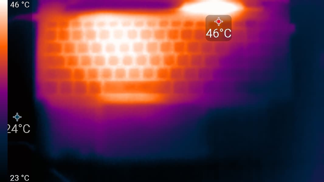 На заднем торце корпуса идет ряд более крупных отверстий, через которые система вентиляции выбрасывает нагретый воздух; на приведенном ниже фото они скрыты выступом петли. Как часто бывает в подобных конструкциях, получается подогрев нижней области экрана — в основном правее середины, где расположен вентилятор системы охлаждения. Во время запуска «тяжелых» тестов выяснилось: нагрев вполне ощутимый, но всё же не критический.