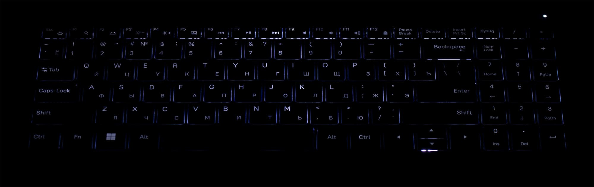 Предусмотрена подсветка — белая, с одним уровнем, не слишком яркая. При неиспользовании клавиатуры в течение 15 секунд она автоматически отключится и вновь включится после нажатия любой клавиши (тачпад не в счет). Ее можно отключить совсем сочетанием кнопок.