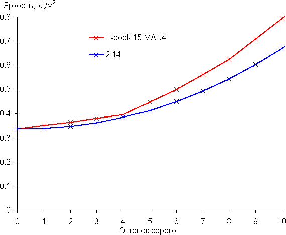 Рост прироста яркости на большей части шкалы серого более-менее равномерный, но в светах монотонность роста нарушается и пара пар оттенков по яркости друг от друга не отличаются. В самой темной области аппаратно и визуально различаются все оттенки: