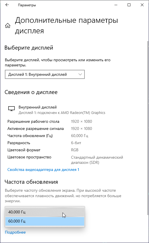 В настройках экрана доступны две частоты обновления — 60 и 40 Гц, вторая снижает потребление на 0,2 Вт. По крайней мере при родном разрешении экрана вывод идет с глубиной цвета 6 бит на цвет.