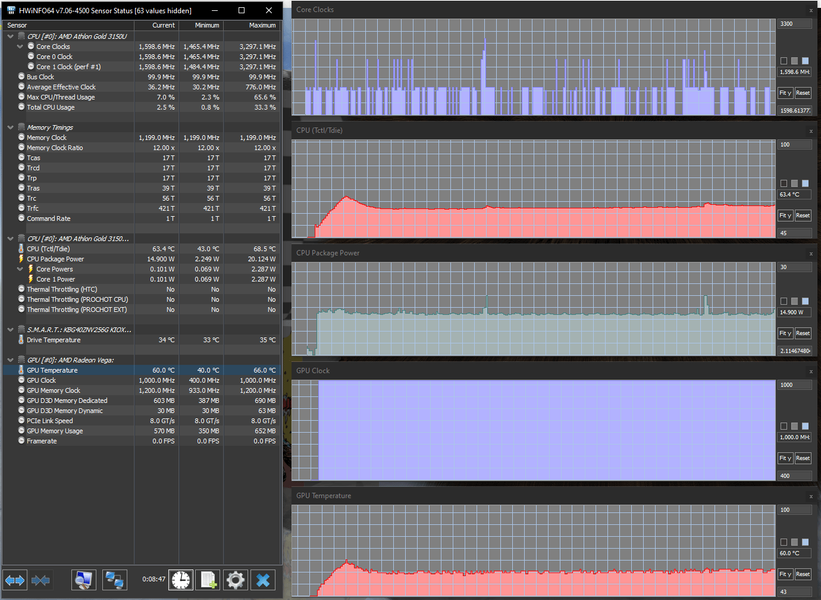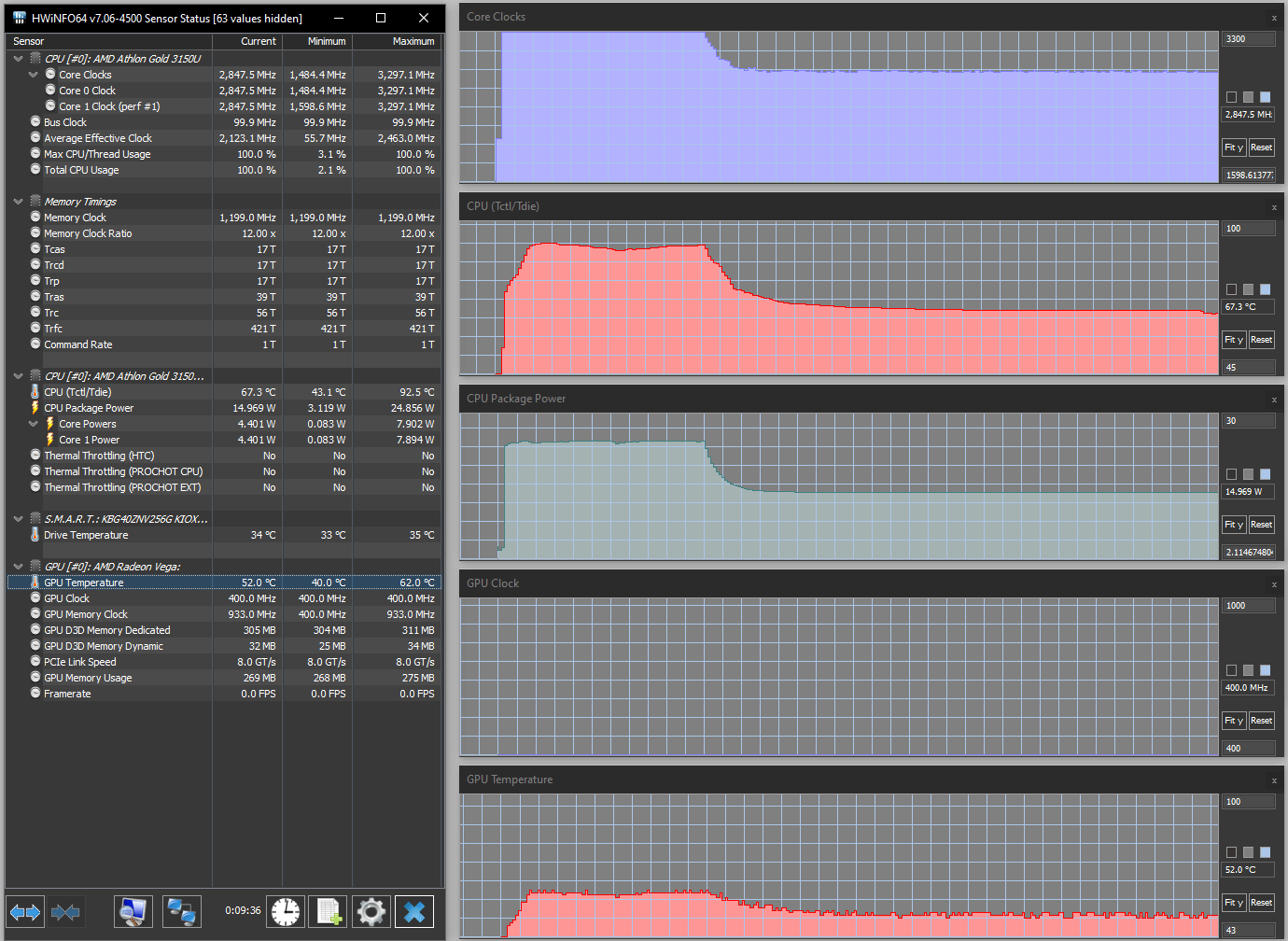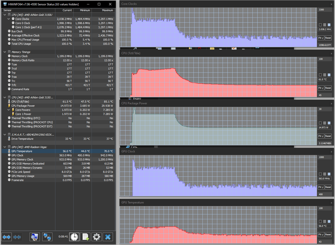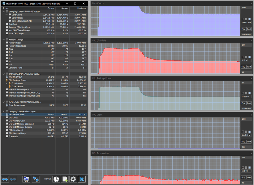 При подаче нагрузки на процессор он довольно длительное время, около трех минут, работает на своей максимальной частоте 3,3 ГГц, соответственно потребление поднимается до обозначенного в спецификации AMD предела в 25 Вт, температура быстро поднимается до 92-93 °C, а вентилятор повышает обороты до максимума. Затем следует спад: частоты — до 2,8-2,9 ГГц, потребления — до 15 Вт, температуры — до 68-69 °C, вентилятор несколько замедляется (к сожалению, отследить скорость вращения невозможно); на этом процесс стабилизируется.