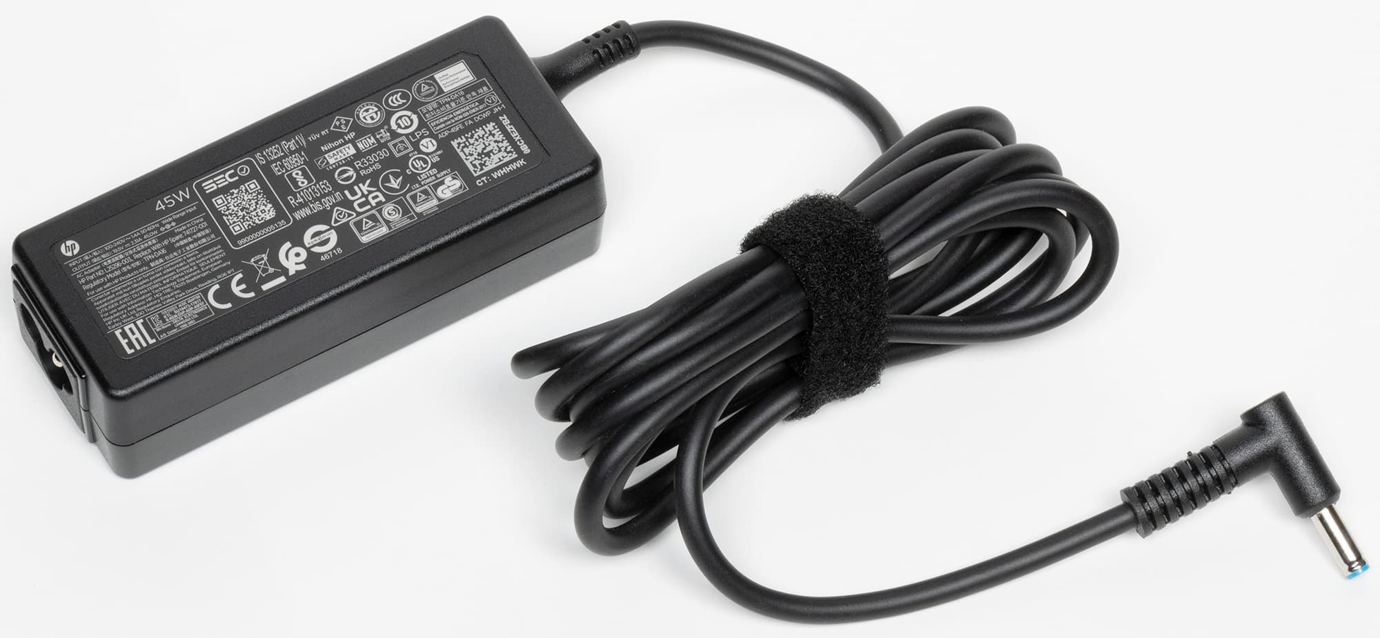 Адаптер питания — небольшая продолговатая коробочка со скругленными гранями, из одного бока которой выходит кабель длиной 1,8 м (без маркировки, довольно толстый, отсоединить его нельзя; есть «липучка» для фиксации в скрученном состоянии). На противоположной боковой поверхности находится гнездо С6 (IEC60320) для сетевого кабеля (длина 95 см, разъемы С5 и «евровилка» CEE 7/7). Зачем в цепи переменного тока потребовались столь массивные трехконтактные разъемы, сказать сложно, но и вес они увеличивают заметно, и места при переноске кабель с такими разъемами занимает немало.