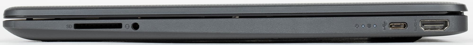 На правом боку сзади — порты HDMI и USB 3.1 Gen1 Type-С, а также два белых индикатора: дисковой активности и питания (горит во время работы и мигает в режиме энергосбережения). При нормальном расположении оператора за ноутбуком эти индикаторы не видны, приходится заглядывать сбоку.