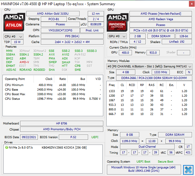 В ноутбуке используется 2-ядерный (4-поточный) процессор AMD Athlon Gold 3150U с базовой частотой 2,4 ГГц и максимальной 3,3 ГГц. Он относится к серии AMD Picasso (Ryzen 3000) и появился довольно давно — анонс состоялся в январе 2020 года. Процессор предназначен для ноутбуков офисного класса, поэтому энергосбережение является определяющим параметром: номинальный TDP составляет всего 15 Вт, но может меняться в пределах 12—25 Вт.