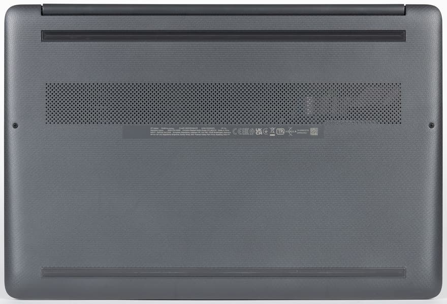 На днище, ближе к задней кромке, имеется область с вентиляционными отверстиями (сама эта область не очень большая, а отверстия мелкие, но их очень много). Через них происходит забор воздуха для охлаждения компонентов, поэтому ставить ноутбук на мягкую поверхность не следует.