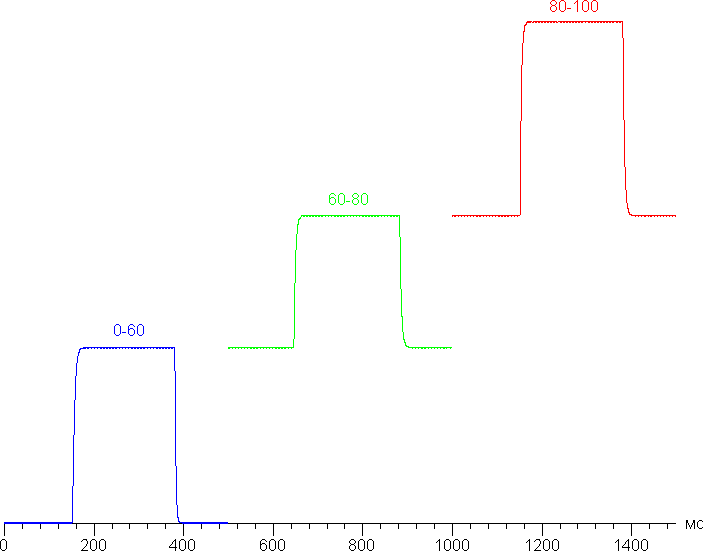 Время отклика при переходе черный-белый-черный равно 11,9 мс (6,9 мс вкл. + 5,0 мс выкл.), переход между полутонами серого в сумме (от оттенка к оттенку и обратно) в среднем занимает 14,4 мс. Матрица быстрая, но разгона в явном виде нет — на фронтах переходов всплески яркости отсутствуют. Для примера приведем графики трех переходов между оттенками 0%, 60%, 80% и 100% (по численному значению оттенка):