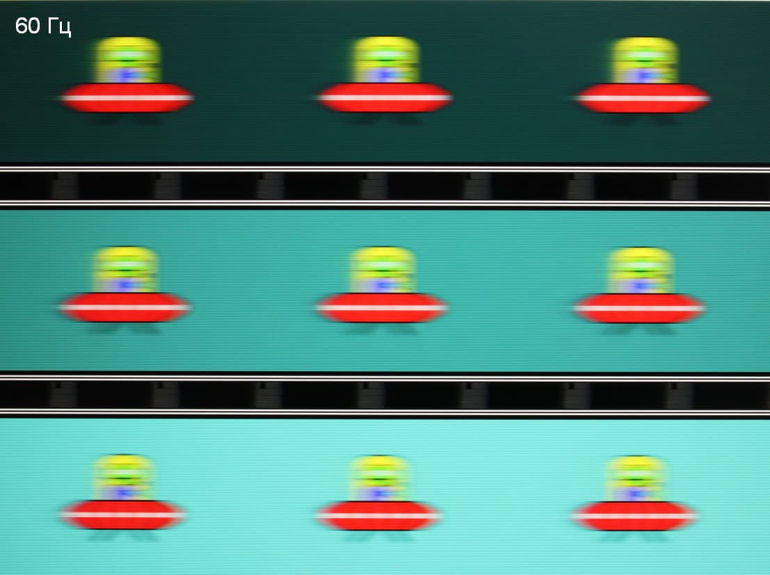 Для наглядного представления о том, что на практике означает такая скорость матрицы и какие артефакты может вызвать разгон матрицы, приведем снимки, полученные с помощью движущейся камеры. Такие снимки показывают, что́ видит человек, если он следит глазами за двигающимся на экране объектом. Описание теста приведено тут, страница с самим тестом тут. Использовались рекомендованные установки (скорость движения 960 пиксель/с), выдержка 1/15 с. Снимки сделаны для кадровой частоты 60 и 144 Гц.