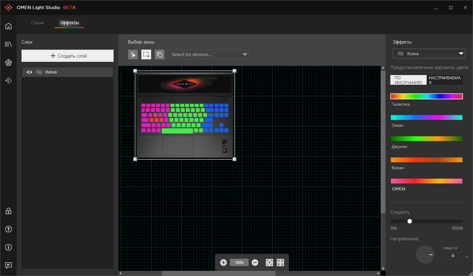 Наконец, прямо из Omen Gaming Hub можно задать статичную подсветку четырех зон клавиатуры, а если это покажется скучновато, можно оттуда же запустить Omen Light Studio. В этой утилите доступны динамические эффекты, в том числе цветомузыка, и для каждого достаточно настроек. Omen Light Studio на момент нашего знакомства находилась в стадии бета-тестирования (как это сейчас принято, тестирование проводится прямо на пользователях). К сожалению, мы столкнулись с неприятной особенностью текущей версии: она некорректно работает в фоне, «отжирая» довольно большой процент времени процессора, причем даже когда подсветка вообще выключена. В обычной жизни вы вряд ли сумеете это заметить, а вот на тестировании автономного режима, особенно с минимальной нагрузкой, фоновая работа Omen Light Studio сильно сказывается. Приходится утихомирить ее штатными средствами Windows.