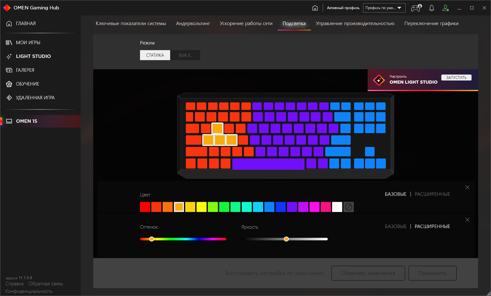 Как и у большинства игровых ноутбуков, клавиатура имеет RGB-подсветку. Она разбита по ширине на три зоны с выделенной четвертой зоной игровых клавиш WASD, можно назначать разные цвета, мигание, переливы цвета и другие привычные эффекты, но только для зон целиком, не для отдельных клавиш. В фирменной утилите Omen Gaming Hub задается вариант статичной настройки подсветки, а для расширенной функциональности можно запустить утилиту Omen Light Studio. С клавиатуры можно только включить последний использовавшийся режим подсветки и выключить ее, яркость же придется задавать в настройках режима.
