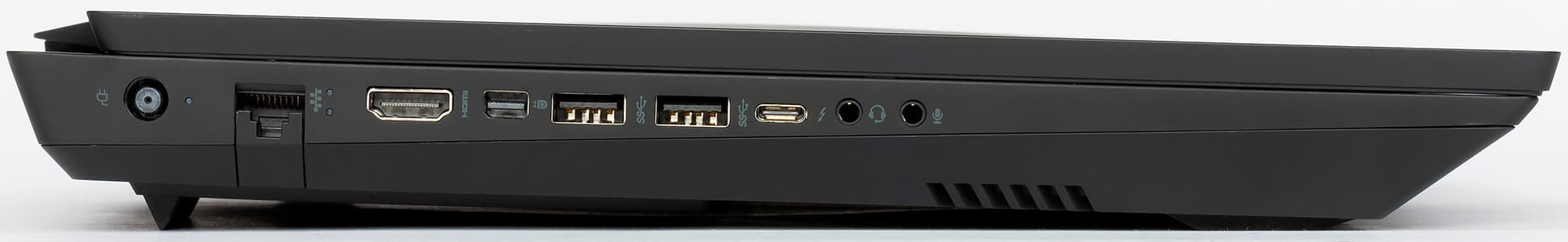 С левой стороны выведены разъем питания, сетевой порт, видеовыходы HDMI и Mini-DisplayPort, два порта USB 3.0 и один USB 3.1 Gen2 (Type-C), а также два аудиоразъема.
