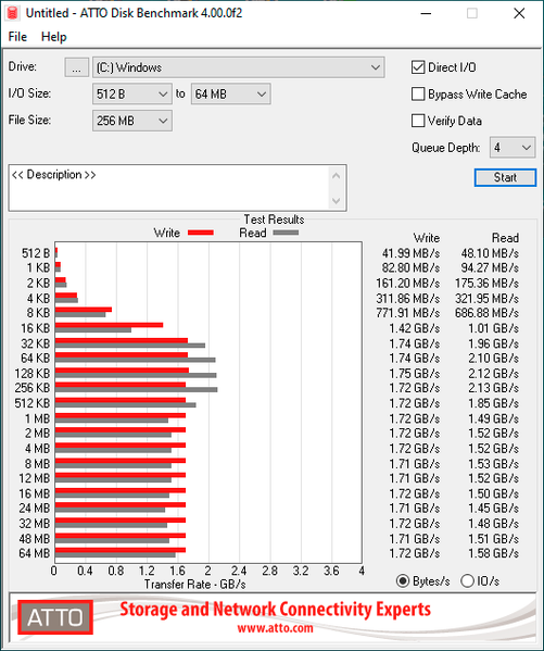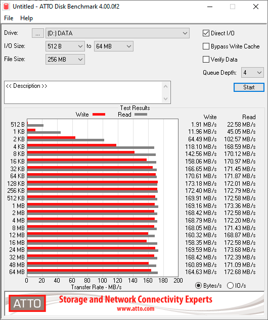 Что касается его производительности, то она вполне стандартна для накопителей этого класса. Вот какие результаты мы получили в тесте ATTO Disk Benchmark.