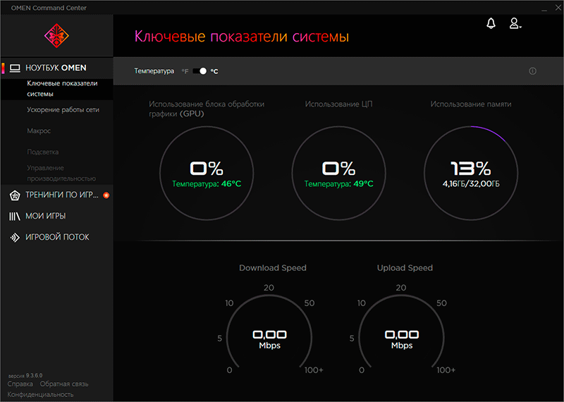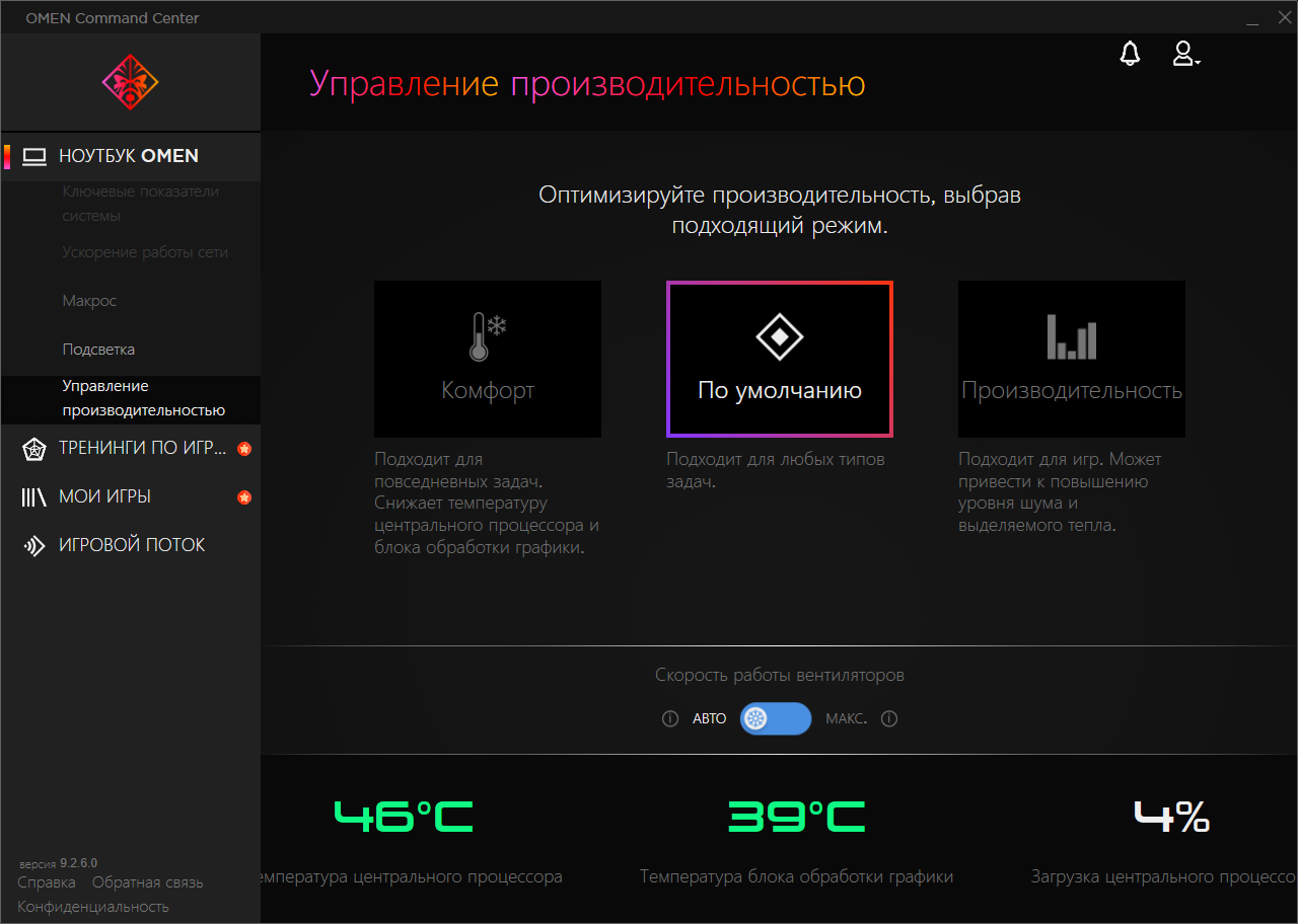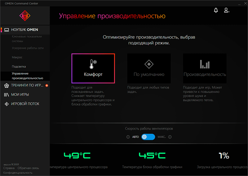 А вот в деле выбора режимов работы ноутбука Omen Command Center никакая другая утилита не заменит. В ней предустановлены три профиля настроек: Комфорт, По умолчанию и Производительность.