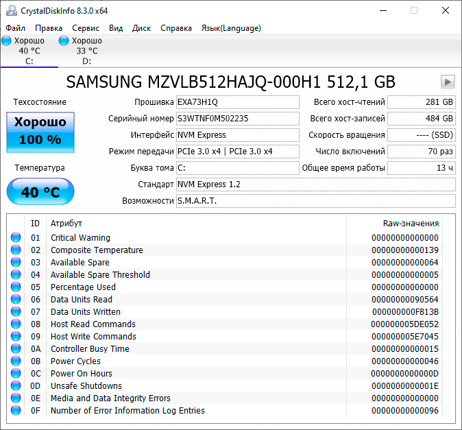 | Накопитель | 1×SSD 512 ГБ (Samsung PM981, модель MZVLB512HAJQ-000H1, M.2 2280, PCIe 3.0 x4) 1×HDD 1 ТБ (Seagate BarraCuda, модель ST1000LM049, SATA 6 Гбит/с) | |