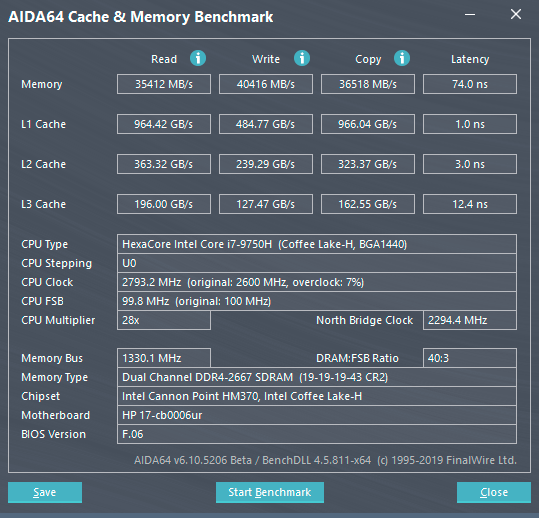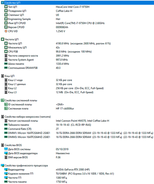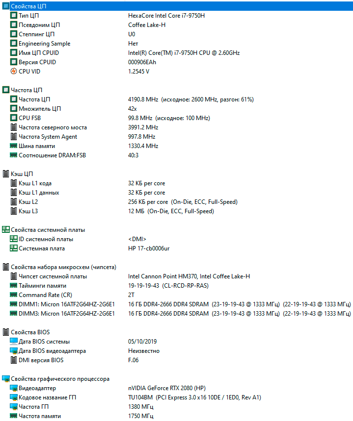 | Процессор | Intel Core i7-9750H (Coffee Lake, 14 нм, 6 (12) ядер, 2,6—4,5 ГГц, 45 Вт) | |