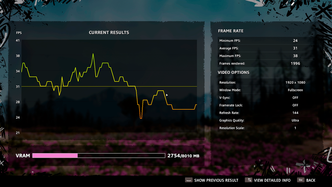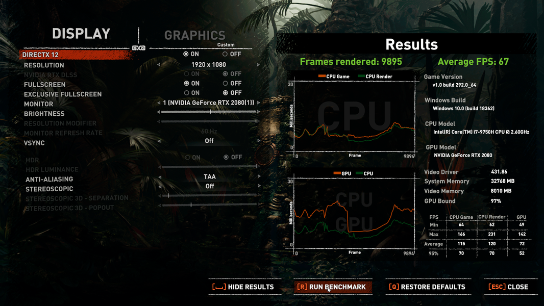 Сначала нужно сказать, что производительность графики в Omen 17-CB0006UR при питании от электросети впечатляет даже бывалых тестеров. Проще сказать, это максимальный на сегодняшний день уровень производительности для мобильных компьютеров, умещаемых в небольшую сумку. Для родного разрешения ноутбука 1920×1080 мощности Nvidia GeForce RTX 2080 хватит для абсолютно любых игровых задач при максимальных настройках качества графики.